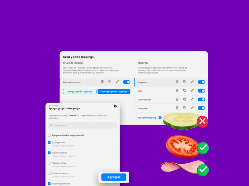 Nueva interfaz para editar toppings:Creamos una nueva interfaz. Ahora es más fácil y amigable editar y crear toppings. Además, puedes prenderlos y apagarlos de manera masiva. -